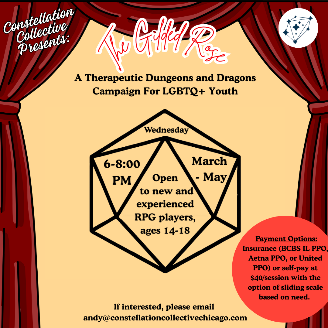 Using the game mechanics and built-in role-play of Dungeons & Dragons and other table-top role-playing games (TTRPG's), these groups offer an opportunity to process real-world struggles in a safe, controlled environment. Participants will work together to explore elements of identity and belonging, solve problems, and build community together.This group is open to all members of the LGBTQ+ community.